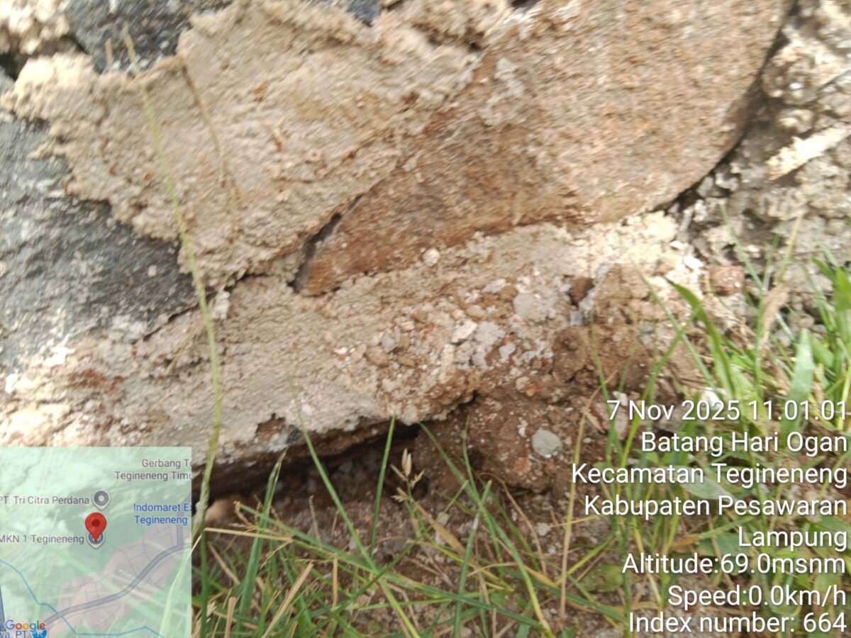 Temuan berikutnya adalah kedalaman pondasi yang terlihat tidak memenuhi standar teknis. Pada beberapa titik, pondasi tampak sangat dangkal, banyak rongga, serta susunan batu kali yang tidak rapat, sehingga berpotensi menurunkan stabilitas bangunan.
