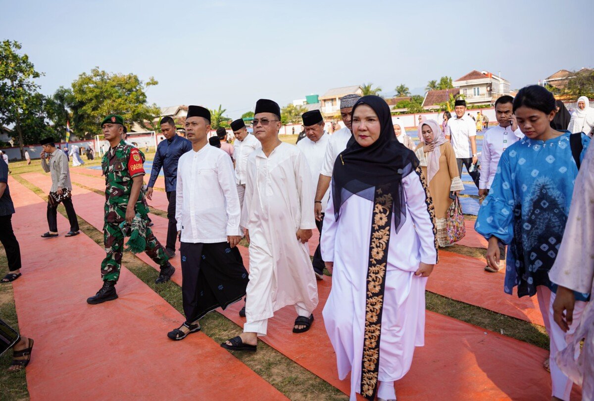 Walikota Bandar Lampung, Eva Dwiana bersama Forkopimda Kota Bandar Lampung melaksanakan sholat Idul Adha di Stadion kecamatan sukarame.